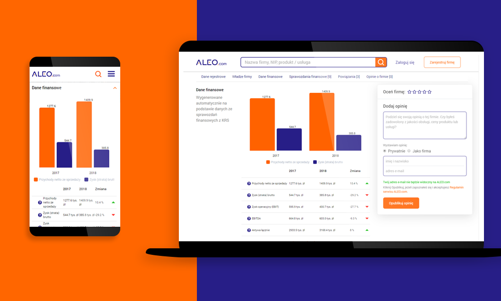 ALEO.com, jako pierwszy serwis internetowy w Polsce, udostępnia szeroki zakres danych finansowych polskich spółek, dostępnych od ręki, bez opłat za pomocą intuicyjnej wyszukiwarki. Informacje dostępne ze sprawozdań finansowych to między innymi przychody ze sprzedaży, zysk brutto czy suma aktywów. To kolejne rozwiązanie, które ułatwia weryfikację partnerów biznesowych i prowadzenie biznesu.