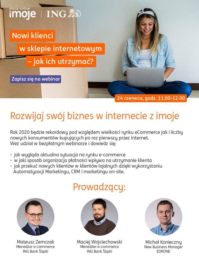 Z ING Bankiem Śląskim rozwój biznesu w internecie jest łatwiejszy. Bank zaprasza na kolejny webinar z obszaru e-commerce. Webinar towarzyszy kampanii dla firm „Działam dalej z ING”.