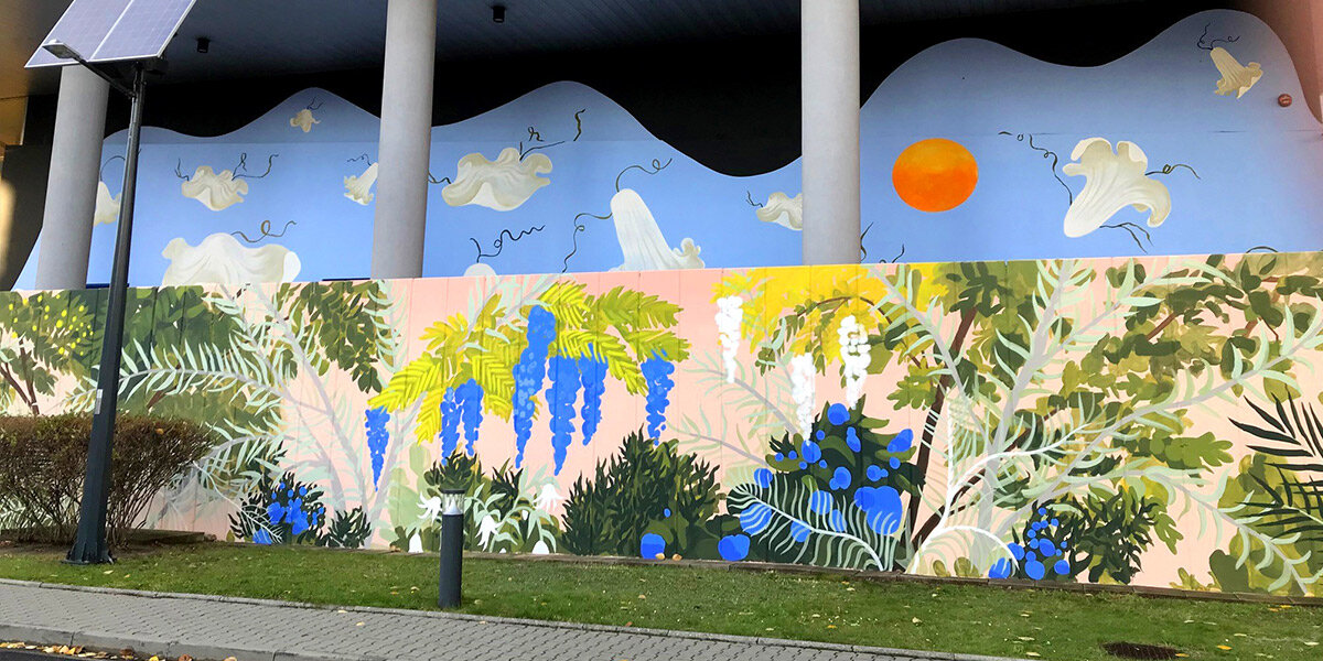 – Mural składa się z trzech dużych ścian, z których każda tworzy osobny obraz, ale wszystkie tworzą podzieloną na plany kompozycje pejzażową. Pierwszy plan to bujny ogród, na drugim planie jest niebo z obłokami, a na trzecim ludzka dłoń sięga po roślinę – powiedziała Magdalena Karpińska.