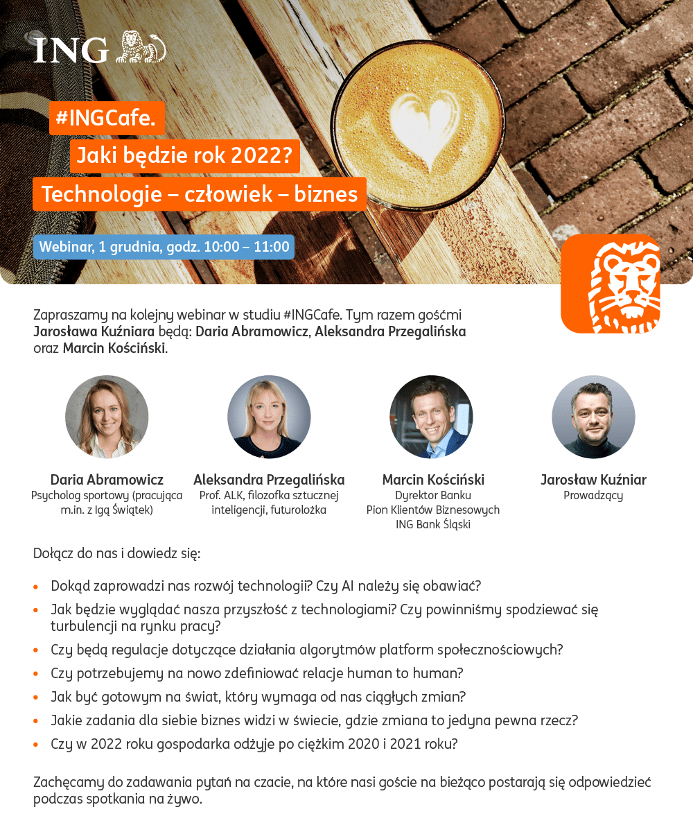 Tym razem gośćmi Jarosława Kuźniara w studiu #INGCafe będą: Daria Abramowicz, psycholog sportowy (pracująca m.in. z Igą Świątek), Aleksandra Przegalińska, Profesorka ALK, filozofka sztucznej inteligencji i futurolożka oraz Marcin Kościński, Dyrektor Banku Pion Klientów Biznesowych ING Bank Śląski.
