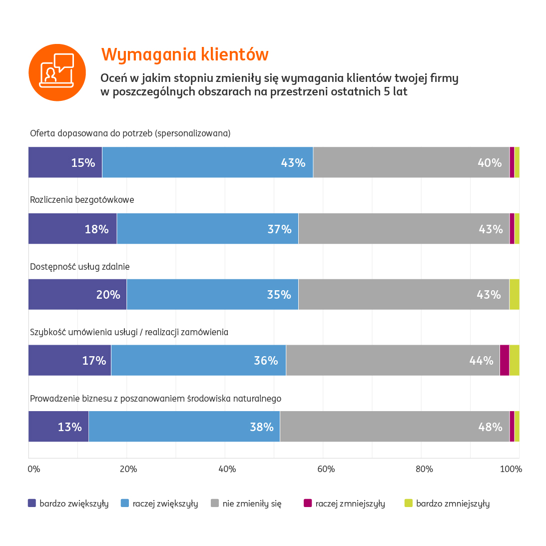 Większe oczekiwania klientów to wyraźny trend, który obserwuje 80 proc. ankietowanych przedsiębiorców. 51 proc. z nich zauważa, że nowe technologie wpływają na taką zmianę na różnych etapach transakcji – od prezentacji oferty po proces płatności.