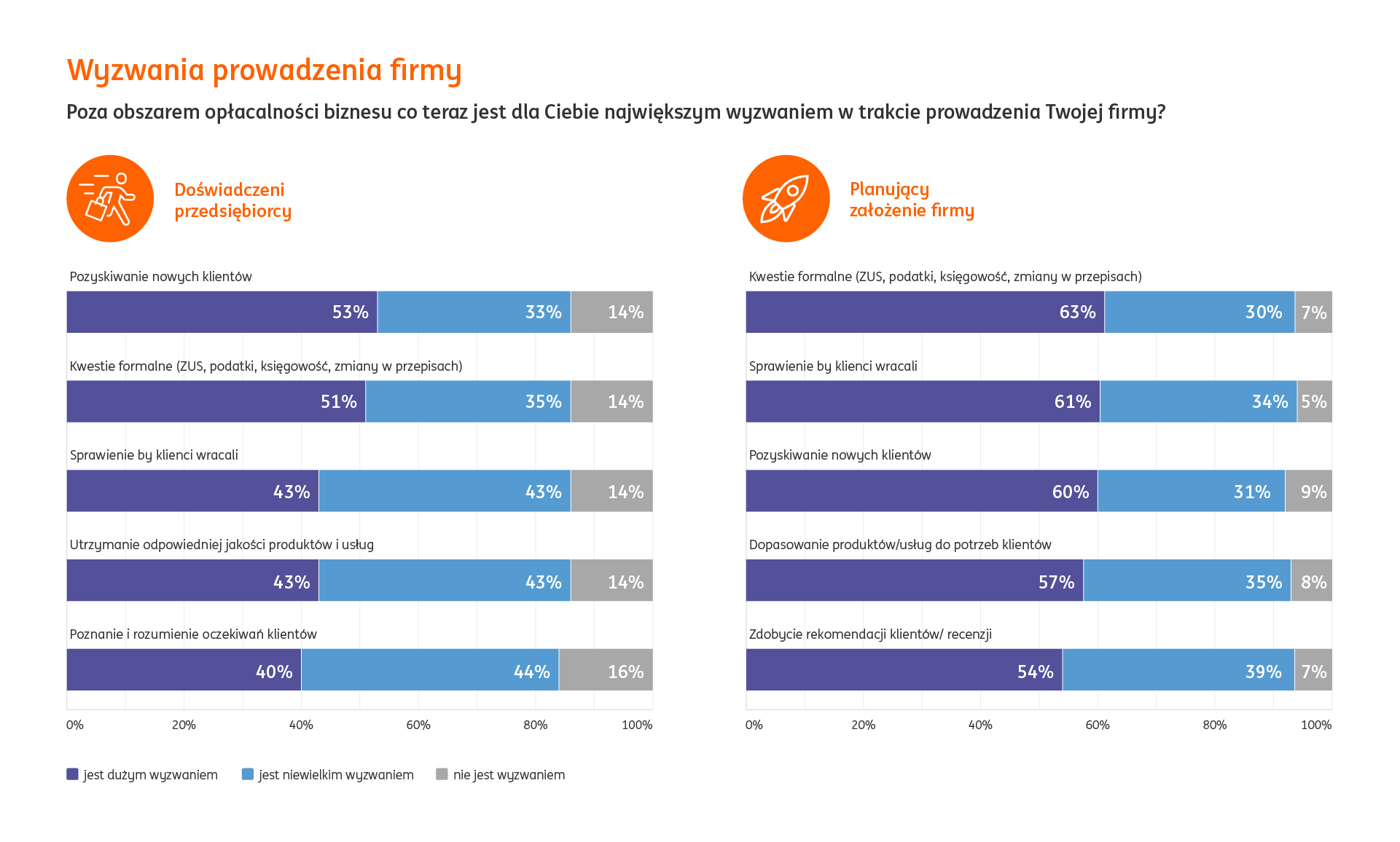 63 proc. osób planujących założyć firmę uważa, że największym wyzwaniem są kwestie związane z księgowością, finansami i podatkami. Następnie wyróżniają trudność w sprawieniu, aby klienci powracali, a dopiero na trzecim miejscu plasuje się u nich pozyskiwanie nowych klientów.