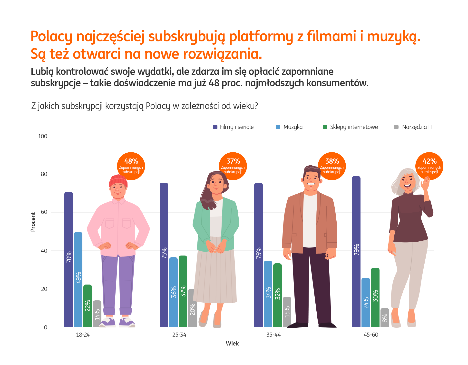 Skłonność do użytkowania subskrypcji jest skorelowana z wiekiem. Najmłodsi respondenci (18-24 lat) korzystają z nich dwa razy częściej, niż najstarsza badana grupa (45-60 lat).