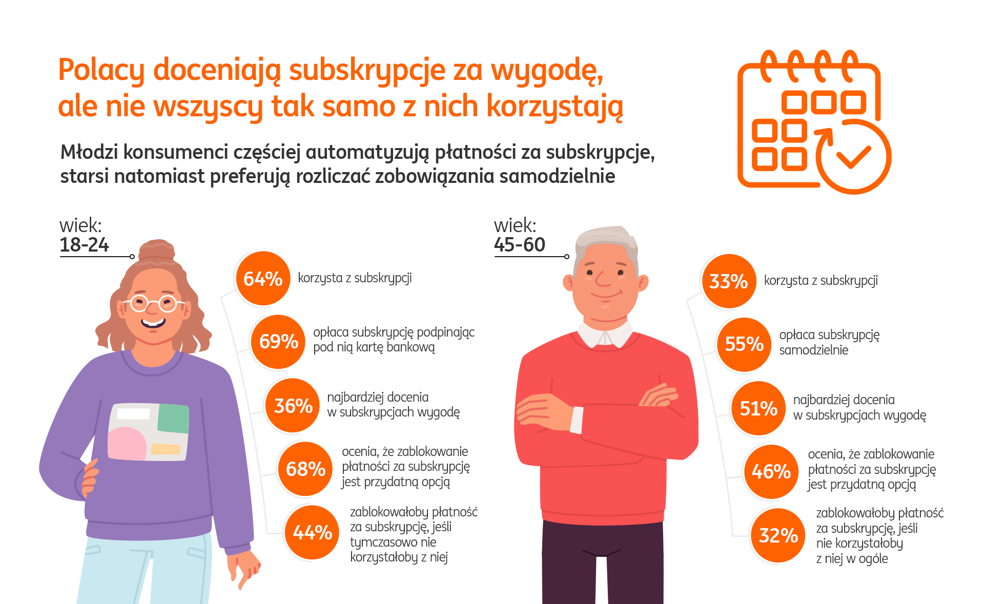 Najważniejszym argumentem za korzystaniem z subskrypcji jest wygoda – wskazało na nią 47 proc. badanych. Nie dziwi więc, że najbardziej popularna forma płatności za tego typu abonament to powiązanie go z kartą bankową, aby cykliczne rozliczenie było automatyczne. W taki sposób swoje zobowiązania za subskrypcje reguluje ponad połowa Polaków. Badanie pokazało, że taka forma płatności jest szczególnie popularna wśród najmłodszej grupy respondentów – wybiera ją aż 69 proc. osób w przedziale wiekowym 18-24 lat. Wraz z wiekiem maleje odsetek osób, które automatyzują swoje cykliczne płatności. Dla kontrastu, osoby ze starszych pokoleń preferują samodzielne opłacanie subskrypcji np. przelewem. Z takiego rozwiązania korzysta aż 55 proc. osób w wieku 45-60 lat.