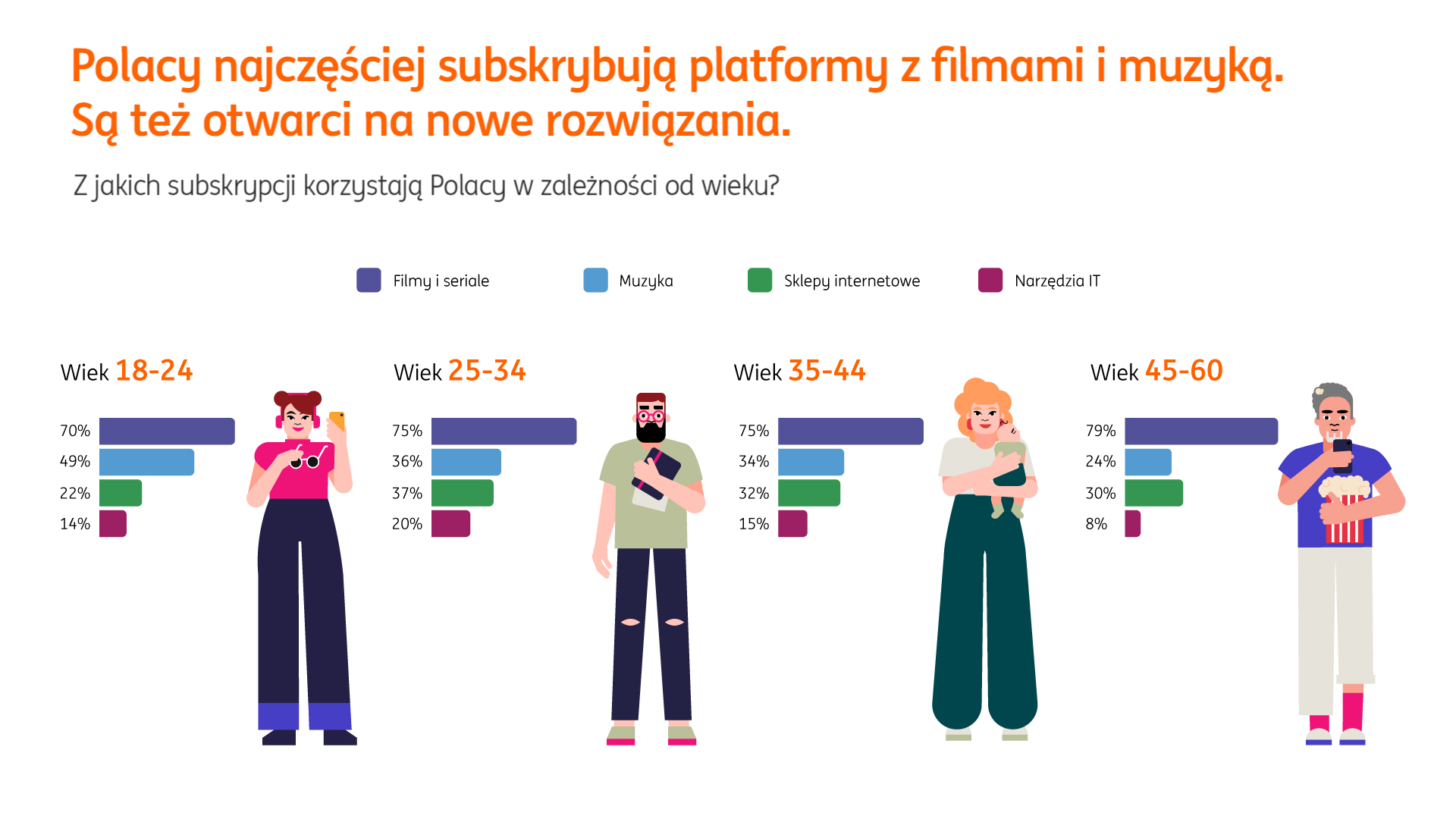 O ile lista najpopularniejszych typów subskrypcji jest dość demokratyczna (streamingi filmów i seriali dominują we wszystkich kategoriach wiekowych), o tyle jeśli przyjrzeć się skłonności do korzystania z samego modelu subskrypcyjnego, wyraźnie widać, że jest to model preferowany przez młodych konsumentów. Dla przeważającej większości osób w wieku 18-24 lat korzystanie z usług subskrypcyjnych to standard (64 proc.), wśród starszych osób tylko 33 proc. decyduje się na to rozwiązanie.