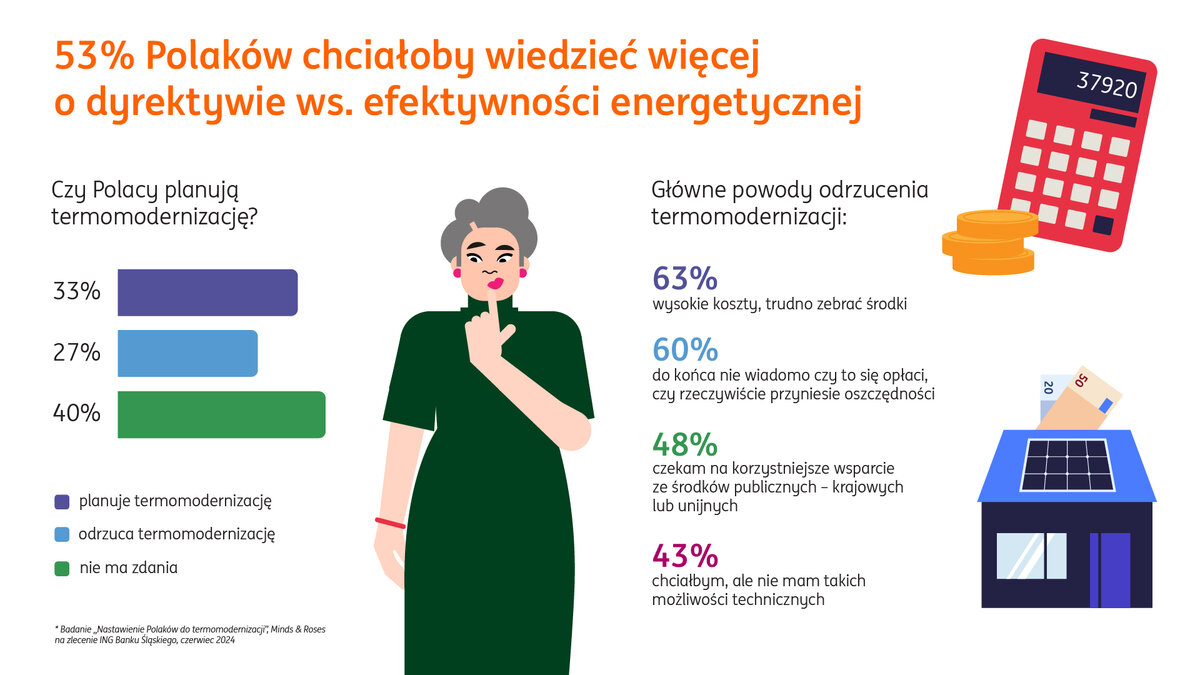 Z badania „Nastawienie Polaków do termomodernizacji” zleconego przez ING Bank Śląski wynika, że respondenci mają niską wiedzę na temat wymogów wynikających z dyrektywy w sprawie charakterystyki energetycznej budynków (EPBD). Nie potrafią jednoznacznie określić czym jest termomodernizacja i brakuje im informacji o dostępnych na rynku rozwiązaniach. Głównymi barierami powstrzymującymi właścicieli domów i mieszkań przed termomodernizacją są obawy przed wysokimi kosztami i brak pewności, że inwestycja się opłaci.