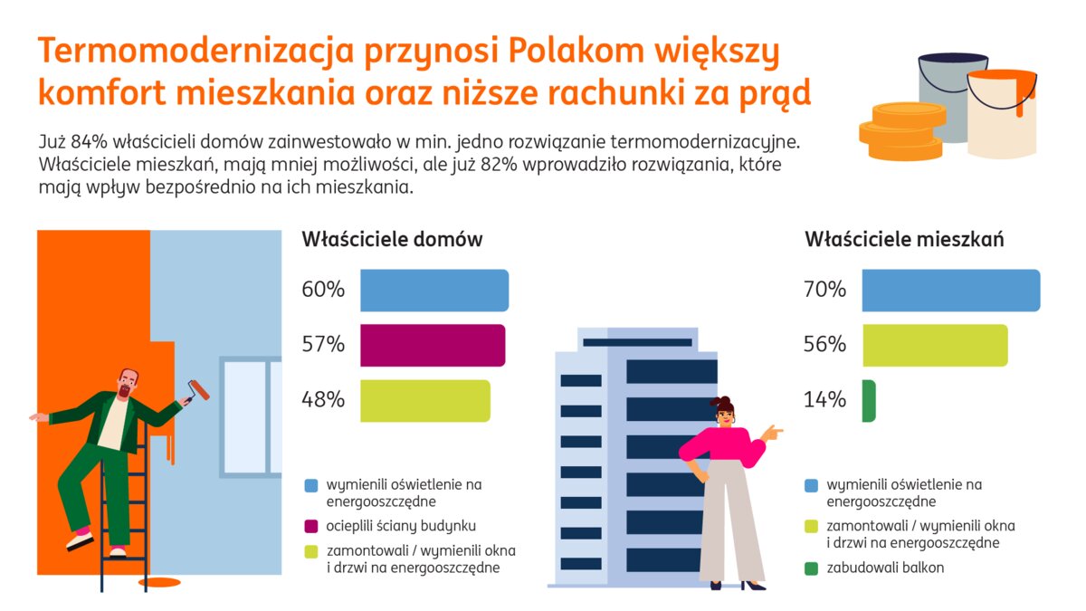 Inwestycje, które właściciele mieszkań już wykonali, są nastawione przede wszystkim na oszczędzanie energii i tak jak w przypadku właścicieli domów – na przybliżenie perspektywy niższych rachunków za prąd i oszczędzania pieniędzy. Aż 70 proc. osób zmieniło oświetlenie na energooszczędne, a 56 proc. wymieniło okna na szczelne. Takie osoby pozytywnie oceniają wprowadzone rozwiązania i potwierdzają, że ich rachunki za prąd są niższe (71 proc.), a komfort mieszkania w takim domu jest wyższy (59 proc.).