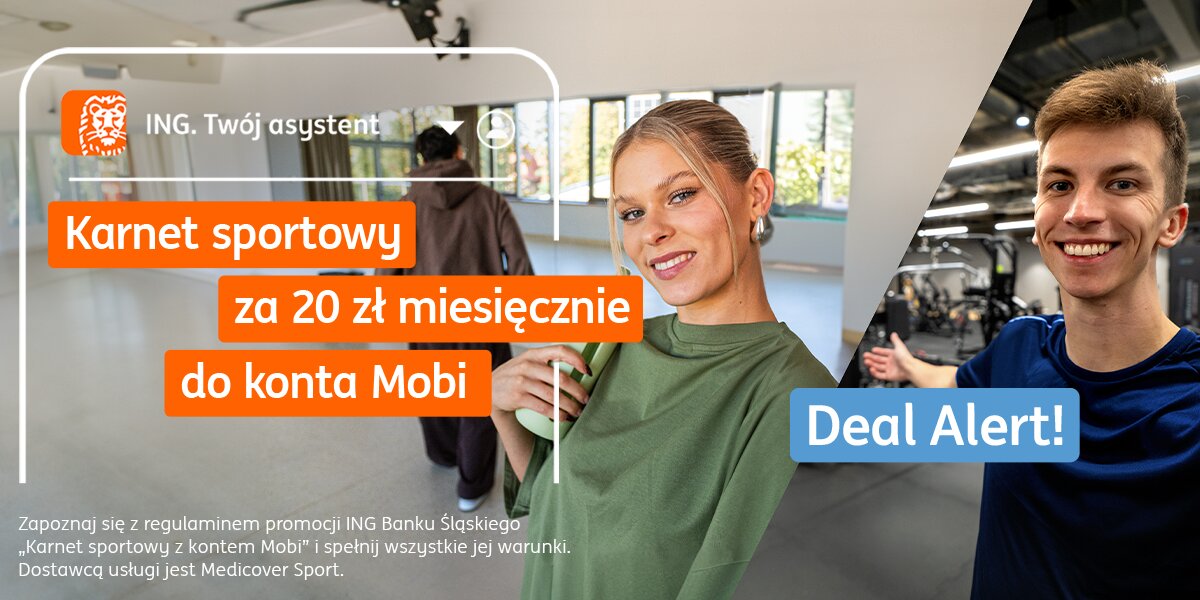 ING Bank Śląski wspiera młodych ludzi w zarządzaniu budżetem i korzystaniu z okazji, które się przed nimi otwierają. Ogarnia dla nich najlepsze deale, bo dba o ich kondycję finansową. Teraz nowi posiadacze konta Mobi 18-26 mogą korzystać z super benefitu - karnetu sportowego w atrakcyjnej cenie 20 zł miesięcznie. To da im większą przestrzeń w budżecie. Młodzi mogą zyskać aż 828 zł nagrody w skali roku!