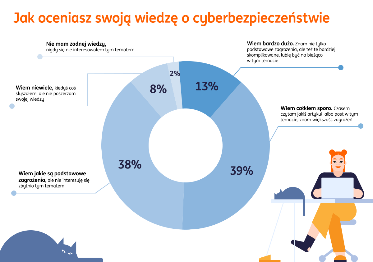 Rzadkie zgłaszanie incydentów do CERT Polska zapewne wynika z tego, że tylko nieco ponad co czwarty przedsiębiorca (28 proc.) zna tę instytucję i wie, co ona robi. Równocześnie 90 proc. przedsiębiorców uważa, że ma przynajmniej podstawową wiedzę o bezpieczeństwie w internecie. Poszczególne rodzaje ataków i metody ochrony przed nimi są jednak znane znacznie mniejszej grupie. Na pytanie o to, czym jest spoofing poprawną odpowiedź wskazała połowa badanych; nieco mniej wiedziało, jaki jest cel ataku DDoS. Najskuteczniejszą metodę ochrony przed phishingiem zdecydowana większość wskazała niewłaściwie – nie jest nią ani firewall, ani antywirus, ale klucz U2F (wskazany przez 28 proc. badanych).