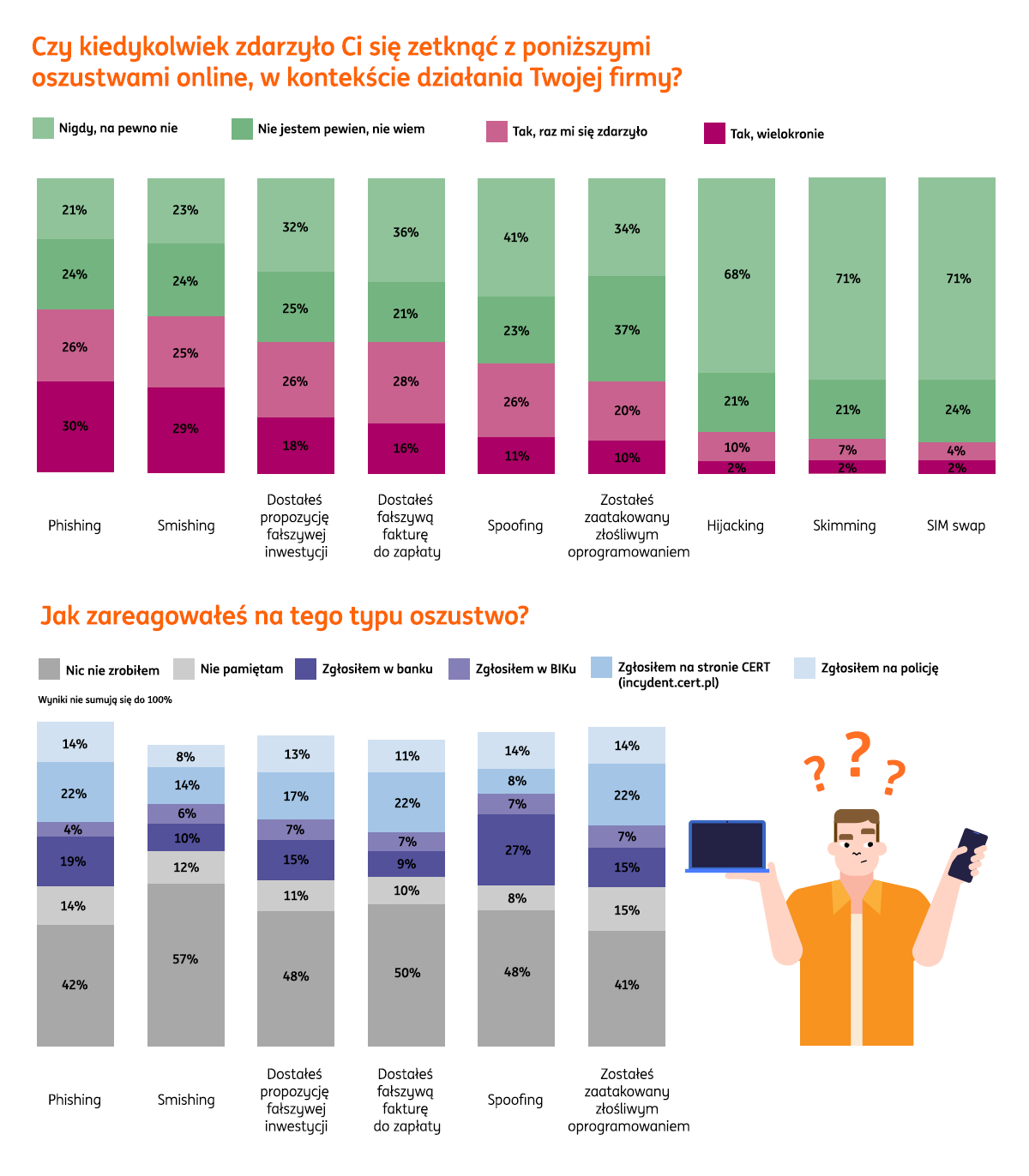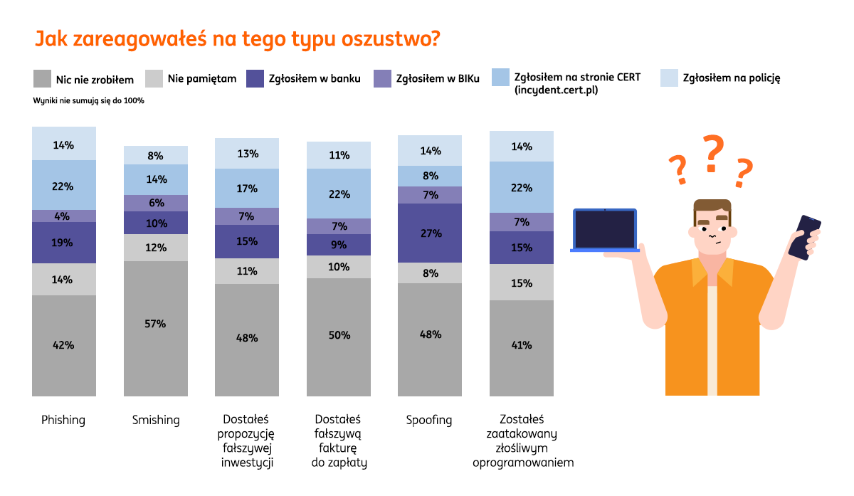 ING zapytał także o to, jak przedsiębiorcy reagują na próbę cyberoszustwa. Okazało się, że najczęściej… nie robią nic. W zależności od typu ataku, od 41 do 57 proc. badanych odpowiedziało, że nie zrobili nic, a dodatkowo od 8 do 14 proc. nie pamiętało swojej reakcji. Wśród osób, które reagowały, po 22 proc. zgłosiło do CERT otrzymanie fałszywej faktury, próby phishingu oraz złośliwe oprogramowanie, ale już tylko 8 proc. zgłosiło spoofing, czyli podszywanie się pod instytucję lub firmę. Do policji zwróciło się – w zależności od typu ataku – od 8 proc. (smishing – SMS z linkiem) do 14 proc. badanych (phishing, spoofing, złośliwe oprogramowanie). Do banków przedsiębiorcy najczęściej zgłaszali próby phishingu (19 proc.) oraz spoofingu (27 proc.).