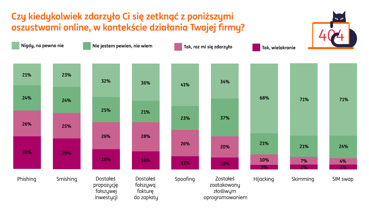 Badanie przeprowadzone na zlecenie ING Banku Śląskiego wskazuje, że ponad połowa polskich przedsiębiorców znalazła się na celowniku cyberprzestępców. 56 proc. badanych odpowiedziało, że zetknęli się z próbą phishingu (otrzymali wiadomość z zainfekowanymi załącznikami lub linkiem do fałszywej strony www). Fałszywą fakturę otrzymało 44 proc. badanych, tyle samo dostało propozycję fałszywej inwestycji.