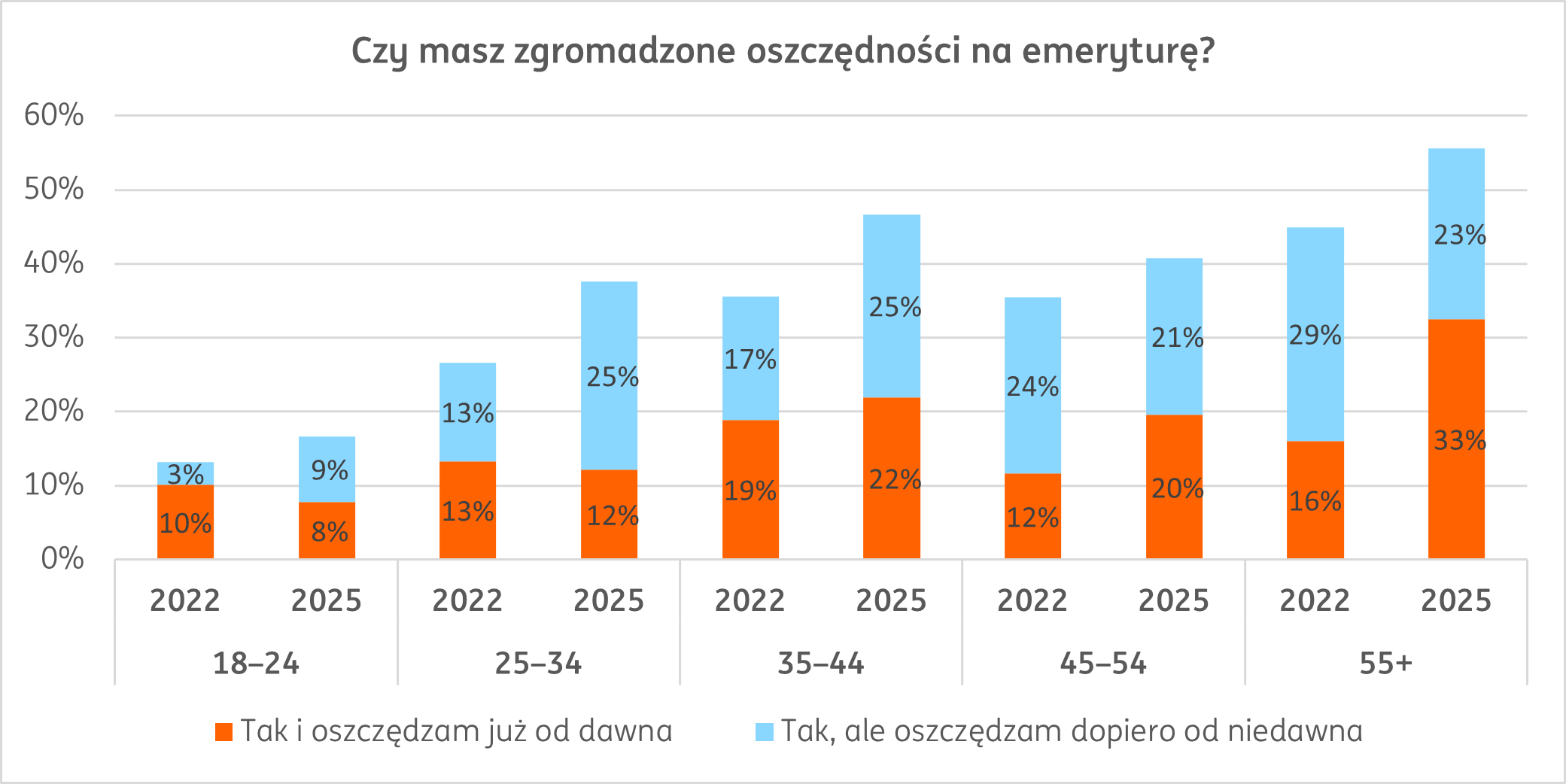 Badanie ING zostało przeprowadzone na grupie 1258 dorosłych mieszkańców Polski mających dostęp do Internetu. Jego poprzednie edycje przeprowadzono w latach 2022 i 2024. Porównanie wyników pokazuje, że w 2025 roku oszczędzanie na emeryturę stało się znacznie bardziej popularne we wszystkich grupach wiekowych.