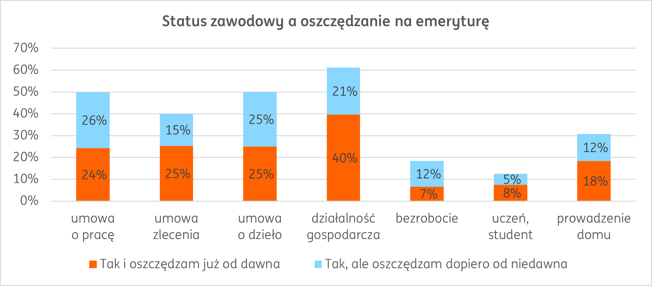 Patrząc na status zawodowy, najwięcej oszczędzających na emeryturę jest wśród osób prowadzących działalność gospodarczą – łącznie 61 proc. Wynika to prawdopodobnie z faktu, że podstawowa emerytura dla przedsiębiorców z ZUS jest niska, a równocześnie do tej grupy należy wielu zamożnych obywateli. Wśród ludzi aktywnych zawodowo, najrzadziej odkładają osoby zatrudnione na umowę zlecenie – robi to 40 proc. z nich, o 10 punktów procentowych mniej niż tych zatrudnionych w oparciu o umowę o pracę oraz dzieło. Różnica może wynikać z tego, że zatrudnieni na umowie o dzieło mają świadomość, że nie mogą liczyć na ubezpieczenie społeczne.