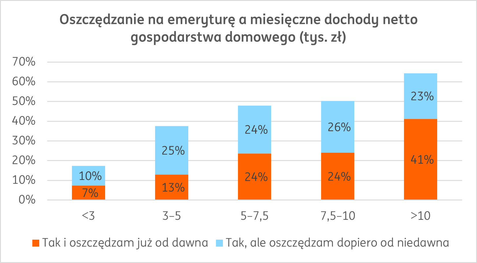 W sumie, w grupie 25-34 lat, odkładanie na emeryturę zadeklarowało już 37 proc. badanych. W kolejnym przedziale wiekowym, 35-44 lat, odsetek ten wzrósł do 47 proc.