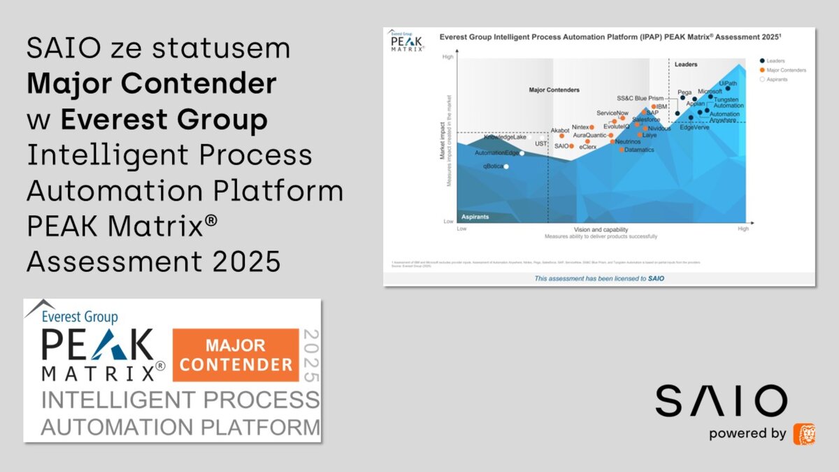 SAIO, które od 2022 roku konsekwentnie pojawia się w zestawieniach PEAK Matrix®, dotychczas pojawiało się w kategorii związanej z technologią Robotic Process Automation (RPA). Tegoroczne wyróżnienie SAIO kategorią Major Contender potwierdza strategiczną ewolucję spółki i dynamiczny rozwój jej portfolio produktowego.