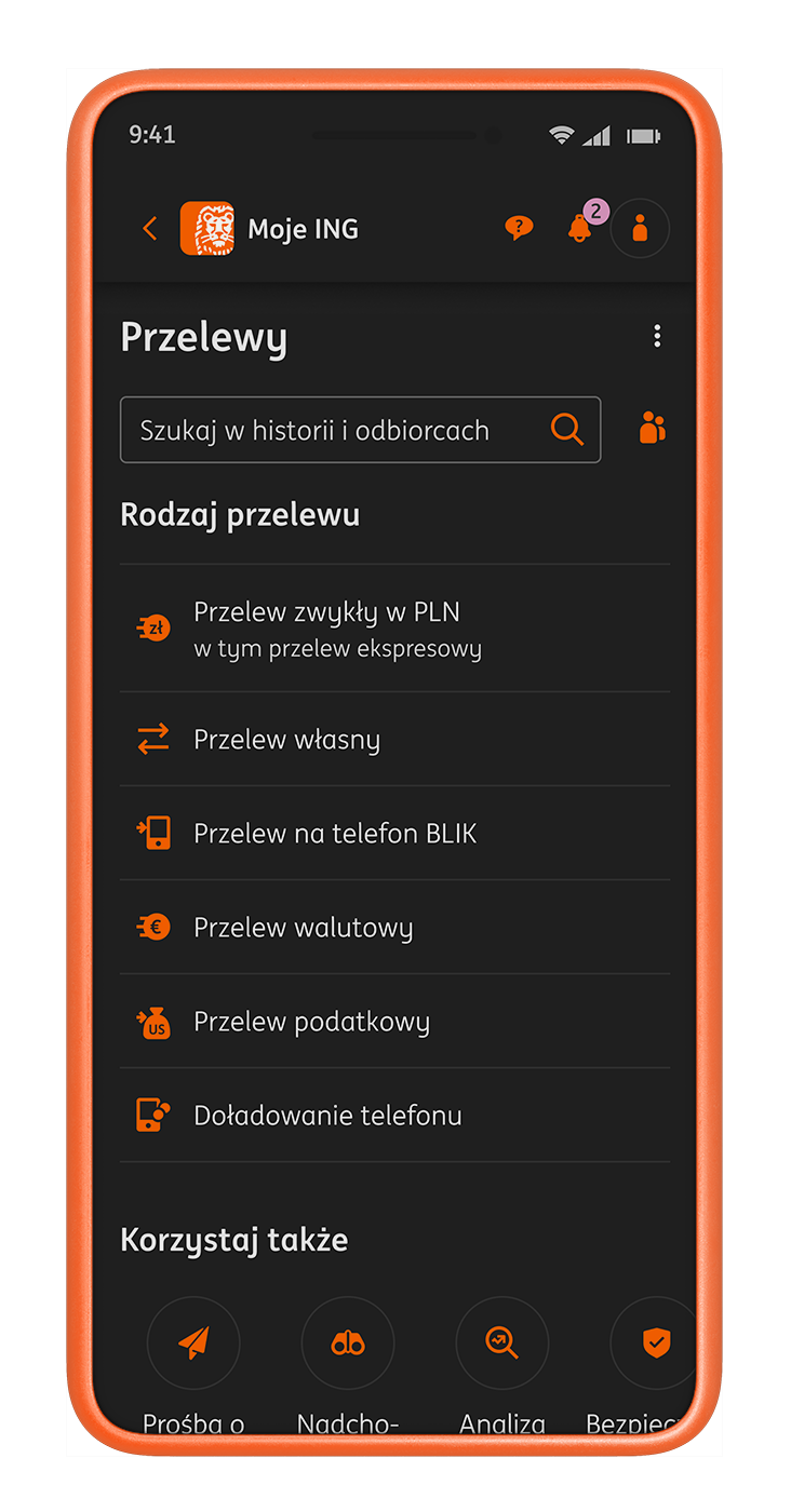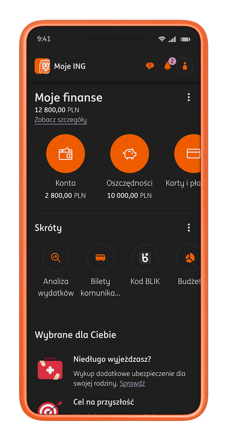 Tryb ciemny to jedno z najczęściej zgłaszanych oczekiwań użytkowników aplikacji Moje ING. Nowa funkcjonalność pozwala zmienić jasny interfejs aplikacji na ciemniejszą wersję, która jest bardziej komfortowa dla wzroku, zwłaszcza przy słabym oświetleniu, oraz lepiej dopasowana do indywidualnych preferencji klientów.